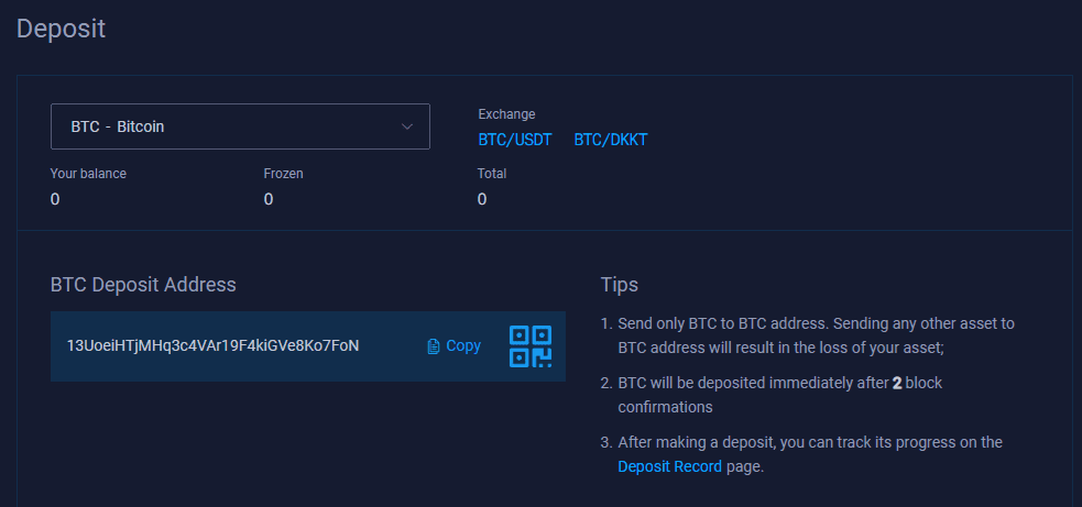 2. выбрать одну из доступных криптовалют и перейти в Deposit.