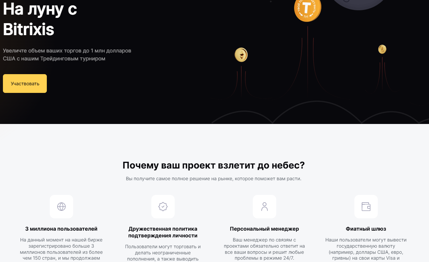 Bitrixis com – это криптовалютный проект и биржа, на которой клиентам доступна маржинальная торговля, спотовый рынок, фьючерсы и инструменты для получения пассивного дохода. Мы проанализировали деятельность платформы, основной функционал, защиту пользовательских данных, отклики аудитории и многое другое, чтобы удостовериться в ее качестве и надежности.