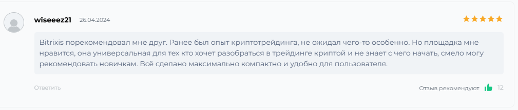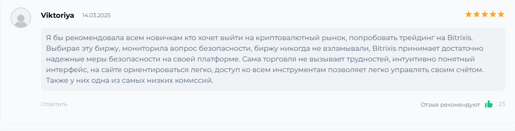 Отзывы о бирже Bitrixis, где бы фигурировали слова «скам» или «лохотрон» нет – большинство пользователей положительно отзываются о работе на платформе. Например, Viktoriya пишет, что биржа отлично подойдет новичкам, которые еще мало знакомы с крипторынком, торговля простая, после создания аккаунта есть доступ ко всему инструментарию.