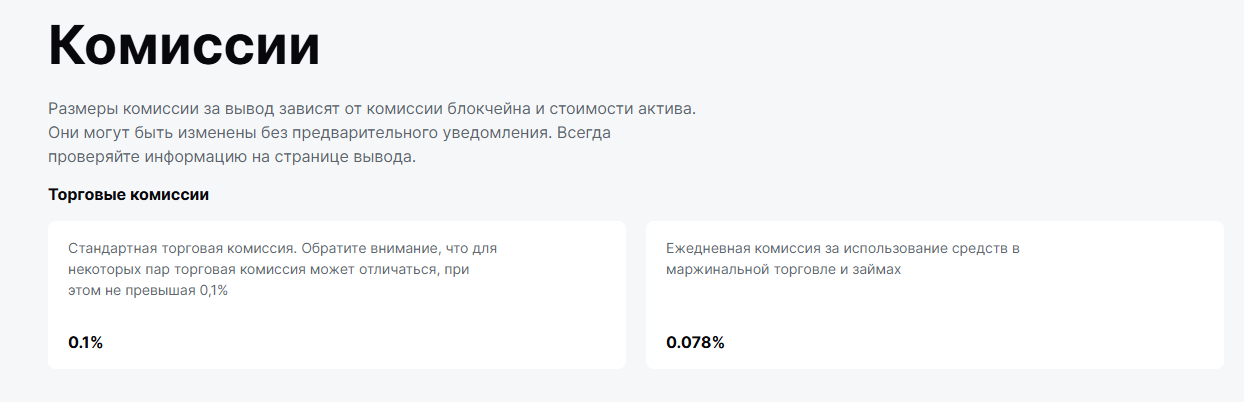 Создатели криптопроекта ничего не говорят о дневных лимитах на пополнение или вывод прибыли, зато открыто дают информацию о комиссиях. Стандартный сбор за маржинальную торговлю – 0,1%, при этом для отдельных валютных пар это число может меняться в меньшую сторону. За использование заемных средств и открытие торговых позиций есть ежедневная комиссия в размере 0,078%.