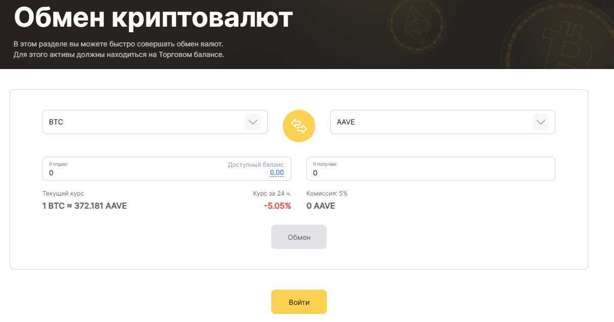 У клиентов площадки есть набор инструментов для взаимодействия с криптовалютным рынком. На сайте есть отдельная вкладка для свопа токенов с фиксацией курса на момент заключения контрактов. Пользователю нужно выбрать валютную пару и указать число токенов на обмен.