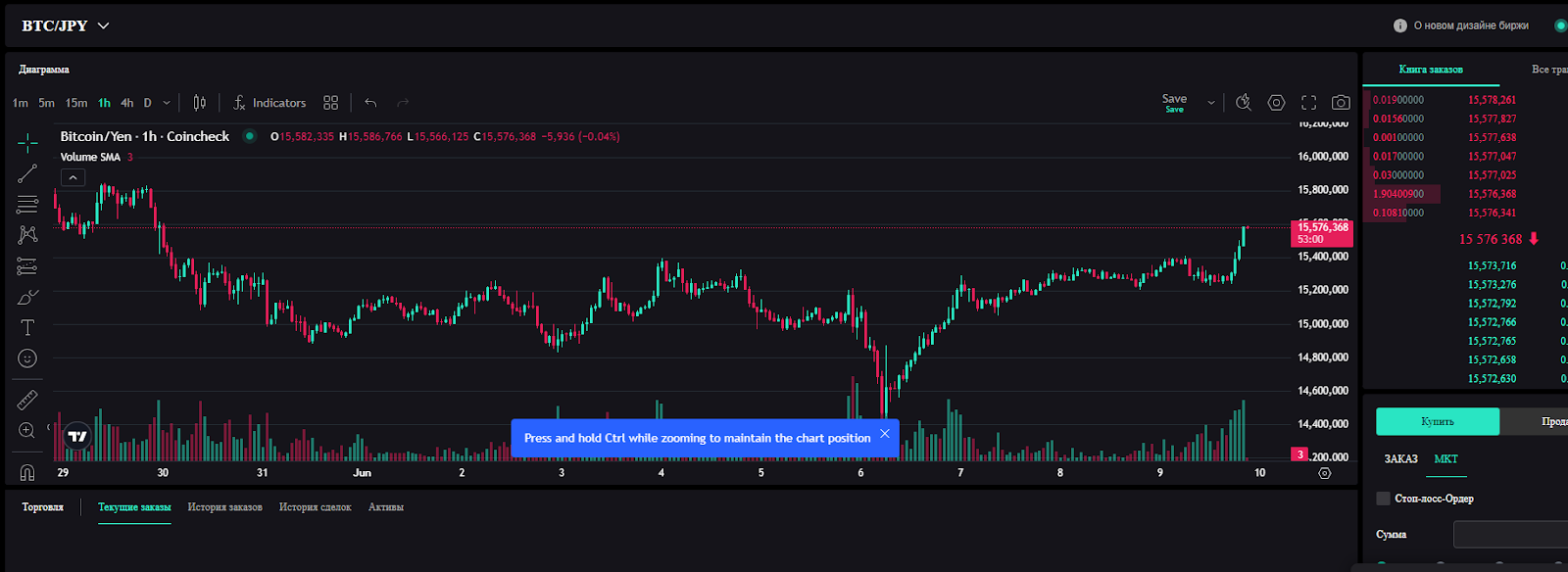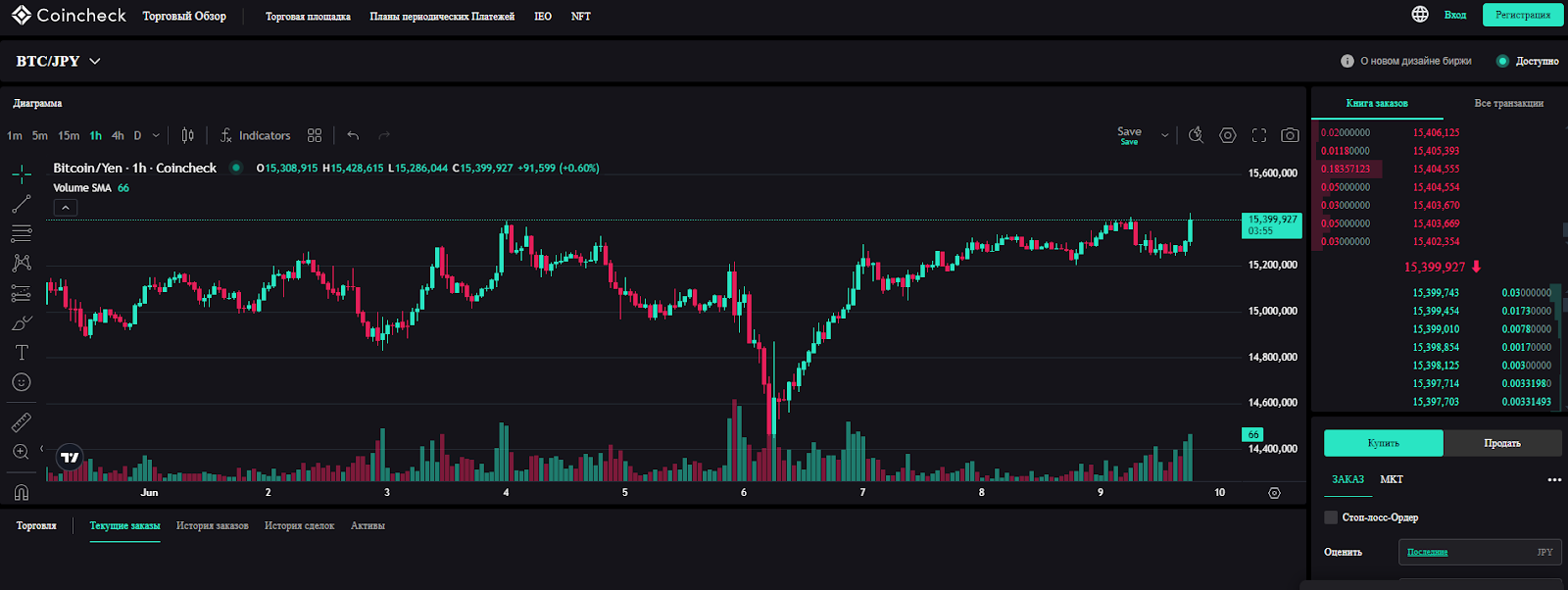 Перейти к торговому терминалу можно с главного экрана Coincheck trade. В нем есть разделы с книгой заказов и историей транзакций.