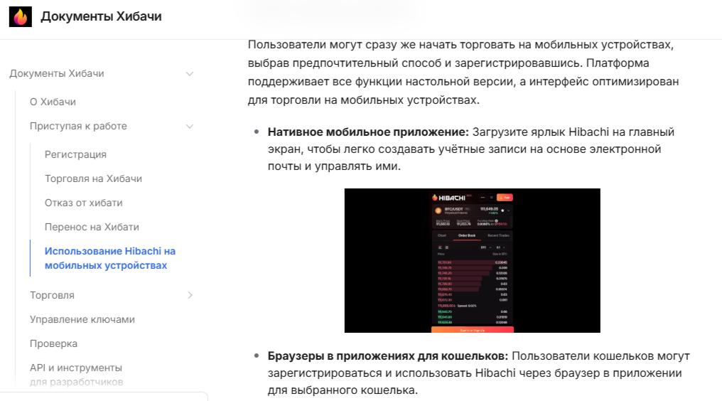 В пользовательском соглашении написано, что трейдеры могут торговать в Hibachi через мобильное приложение. Оно содержит полный набор функций, но имеет адаптированный под размеры экрана смартфона интерфейс.