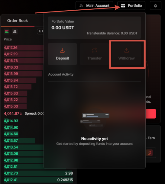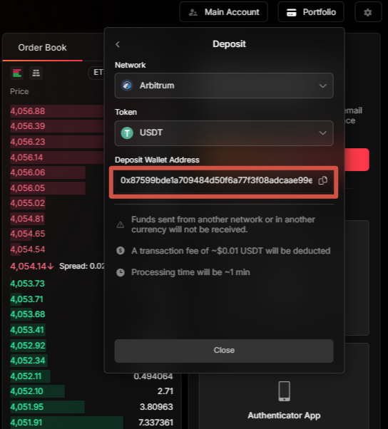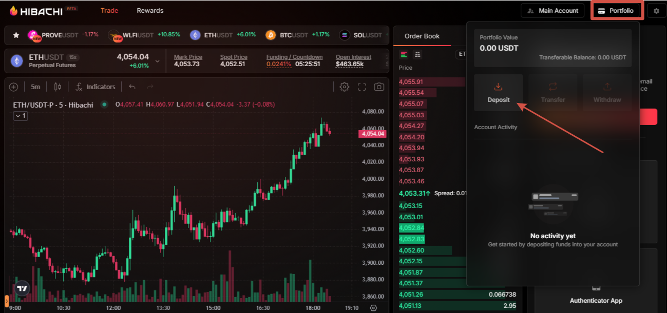Для внесения депозита на Hibachi необходимо перейти в раздел Portfolio, а затем в представленном меню выбрать опцию Deposit. Пополнять торговый счет можно единственным способом ― средствами с привязанного криптовалютного кошелька.