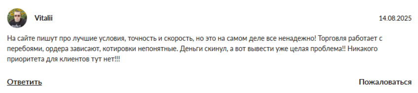 Основной недостаток, который указывают в отзывах пользователи ― недоработанность сервиса. Трейдеры утверждают, что в торговом терминале отображаются некорректные котировки, а ряд функций срабатывает с опозданием, что приводит к убыткам.