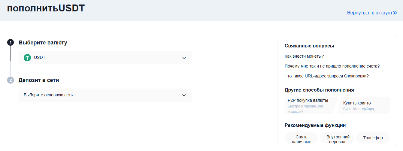 Внести депозит можно в личном кабинете, кликнув на кнопку «Пополнить». В выпадающем списке потребуется выбрать желаемую криптовалюту, а также сеть. Для пополнения останется только переслать средства на сгенерированный адрес или QR-код.
