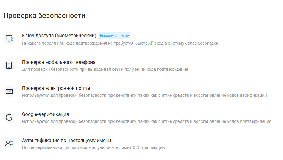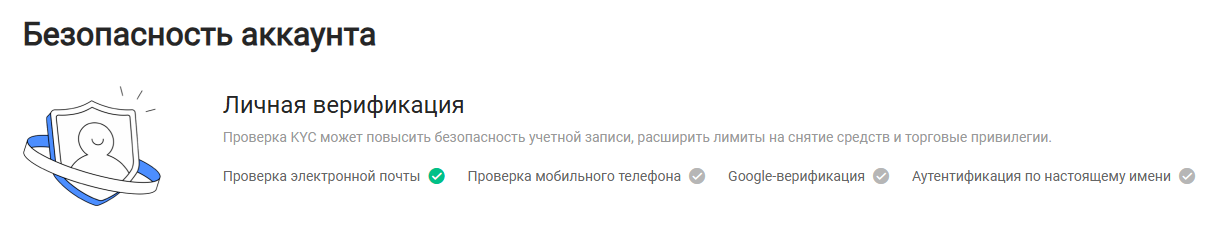 Верификация на платформе не обязательна, однако она потребуется для пополнения счета с банковской карты и расширения лимитов. Чтобы пройти идентификацию, необходимо перейти в личный кабинет, а затем, кликнуть на «Безопасность аккаунта».