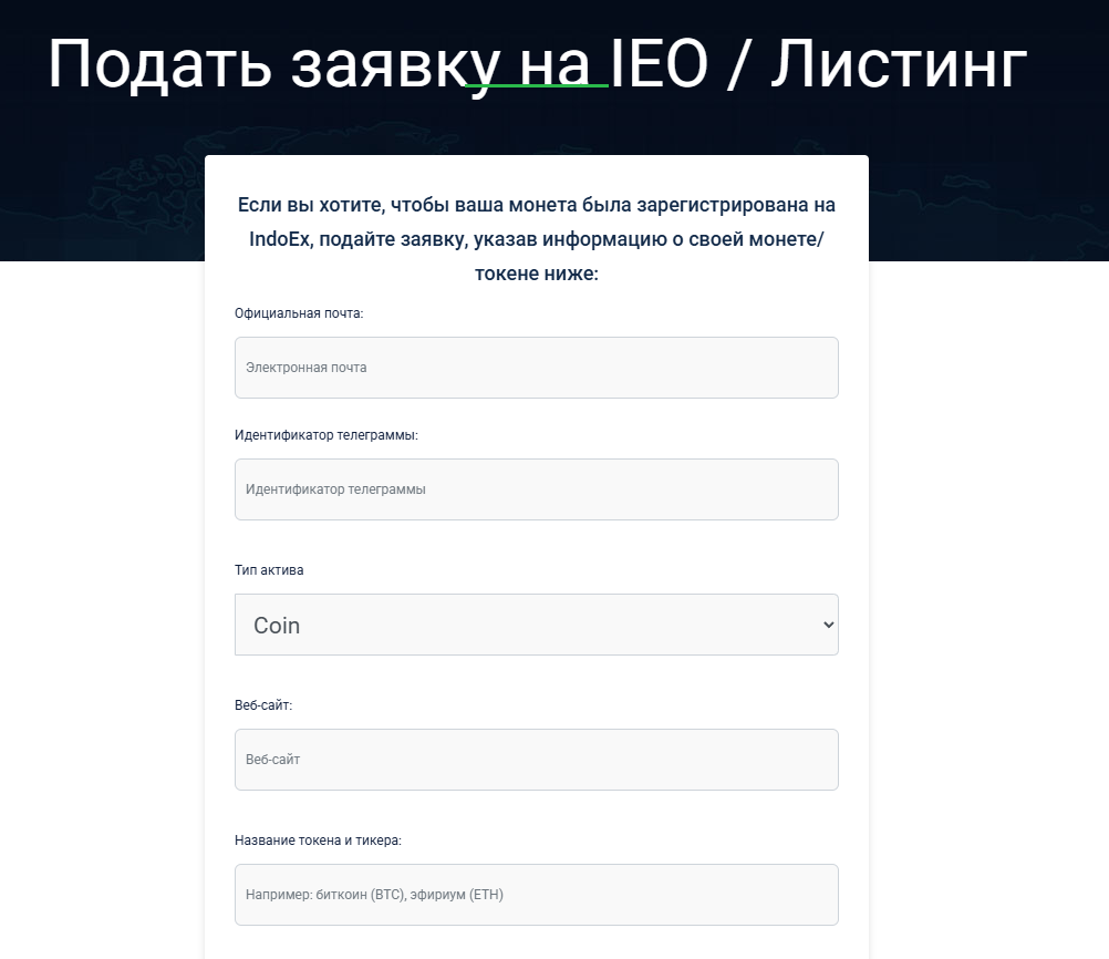 Помимо простого трейдинга криптой, на площадке можно провести IEO/листинг новых токенов. Для этого в специальном разделе нужно заполнить заявку, дождаться ответа от техподдержки Indoex io и обговорить со специалистов условия первичного размещения.