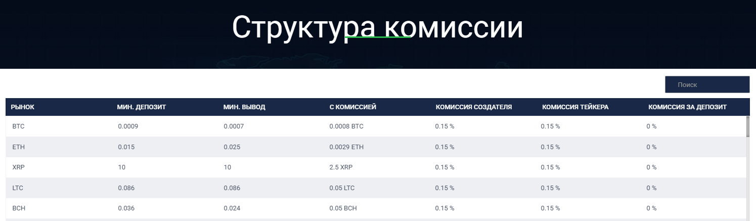 Условиям сотрудничества с биржей Indoex Ltd посвящен отдельный раздел. Структура комиссий зависит от выбранного актива. Например, минимальный размер депозита в BTC – это 0.0009, а сервисный сбор для тейкеров и мейкеров составляет 0.15%. Для ETH минимальное пополнение будет уже 0.015, а вывод – 0.025. При более тщательном анализе сводной таблицы становится понятно, что комиссия для тейкеров и мейкеров не зависит от выбранного актива, а зафиксирована на уровне 0.15%.
