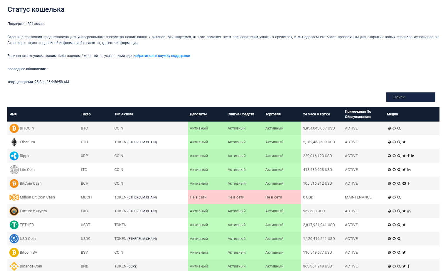 Убедиться в надежности биржи можно благодаря разделу со статусом активных кошельков, работающих в реальном времени. В интерактивной таблице отображены основные хранилища монет, объем токенов, статус и другие параметры.