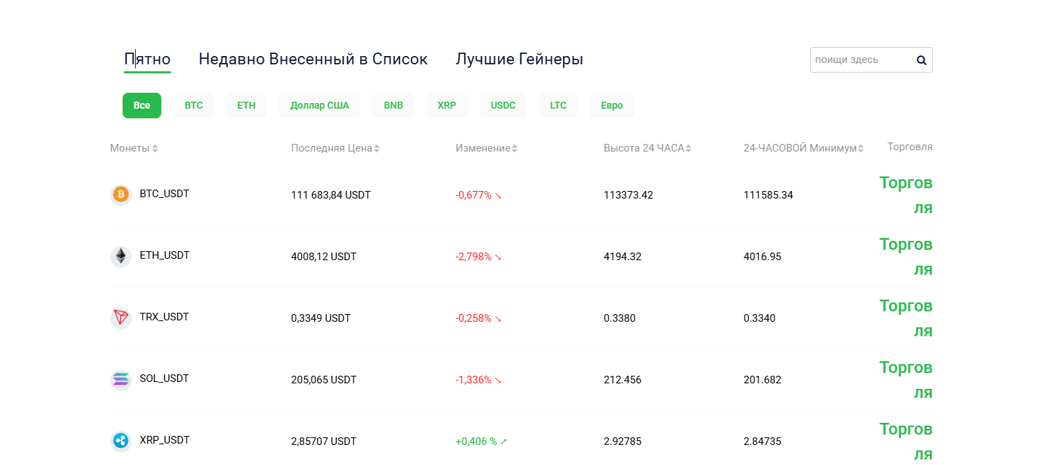 Основное назначение биржи – это маржинальная торговля на спотовом рынке, транзакции с фьючерсами не предусмотрены. Во вкладке, посвященной доступным активам, есть полный перечень валютных пар с гарантированной ликвидностью: BTC, и USDT, и ETH, другие токены, востребованные на рынке.