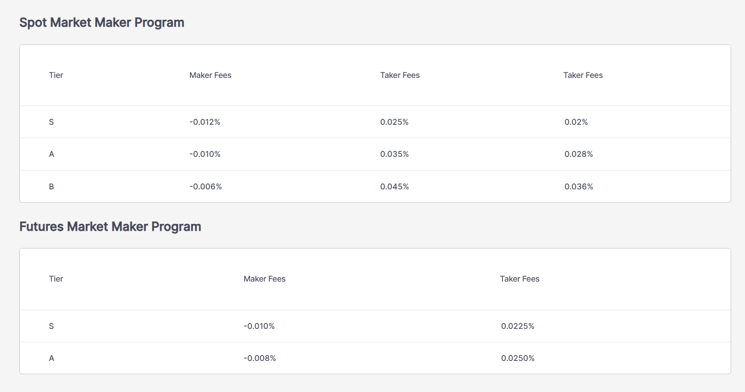 Про лимиты на площадке информации нет. О комиссиях написано только в разделе для маркет-мейкеров, причем указаны фьючерсы, которых на бирже нет. Все сборы для мейкеров отрицательные и составляют от –0,008% до –0,012%. Для тейкеров указаны комиссионные от 0,02% до 0,045%, но куда какие относятся, непонятно.