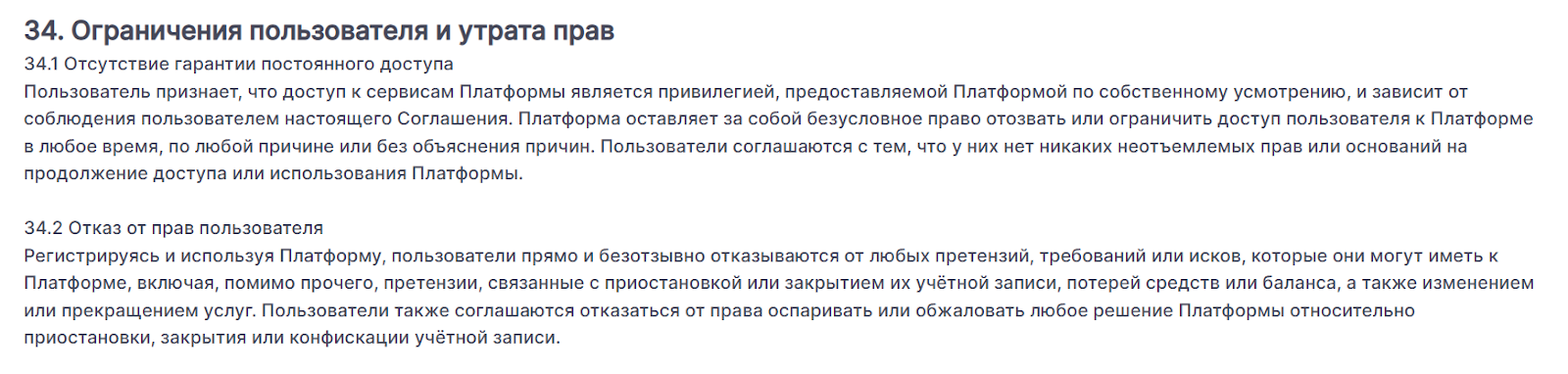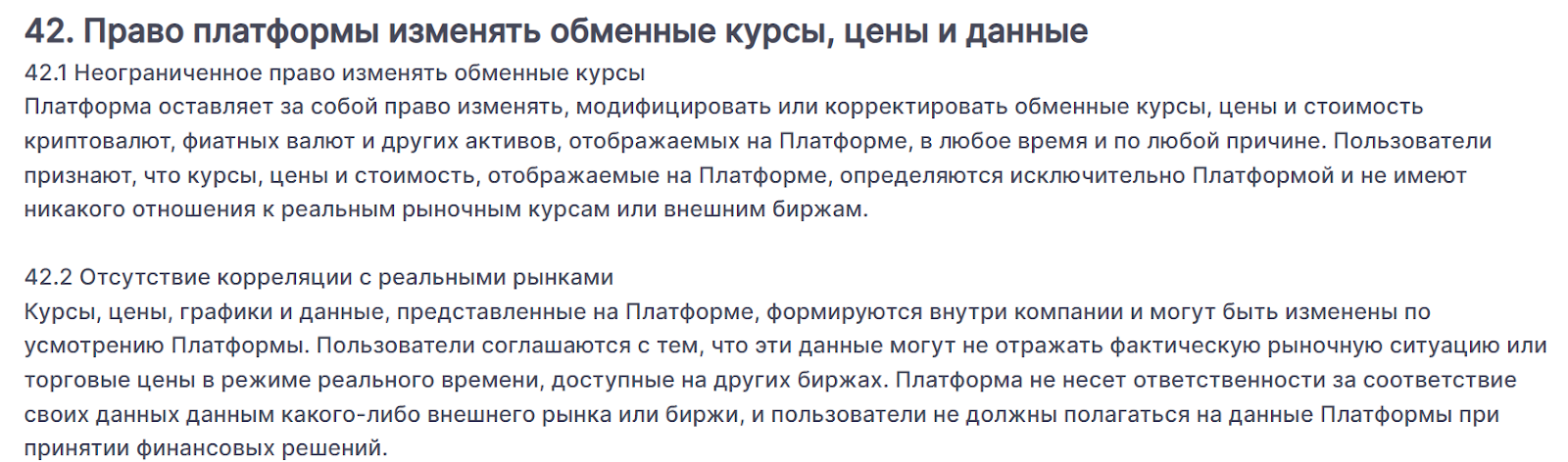 - Пользователи не могут подать в суд на биржу, а вся ответственность за убытки лежит на них, что закреплено в условиях сотрудничества;