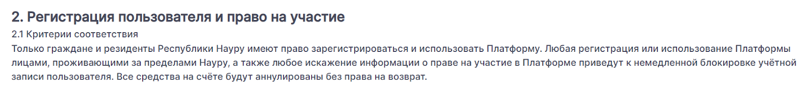 - В правилах написано о доступности площадки только для жителей Науру, но пройти верификацию могут и пользователи из других стран, что противоречит установленным самой же компанией правилам;