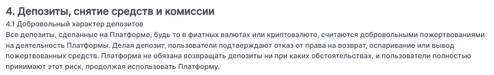 Так а что вы хотели, если в Правилах есть такой 4 пункт по депозитам и даже там указывается, что биржа в праве рассматривать внесённые деньги на счёт как пожертвование и не обязана их возвращать.