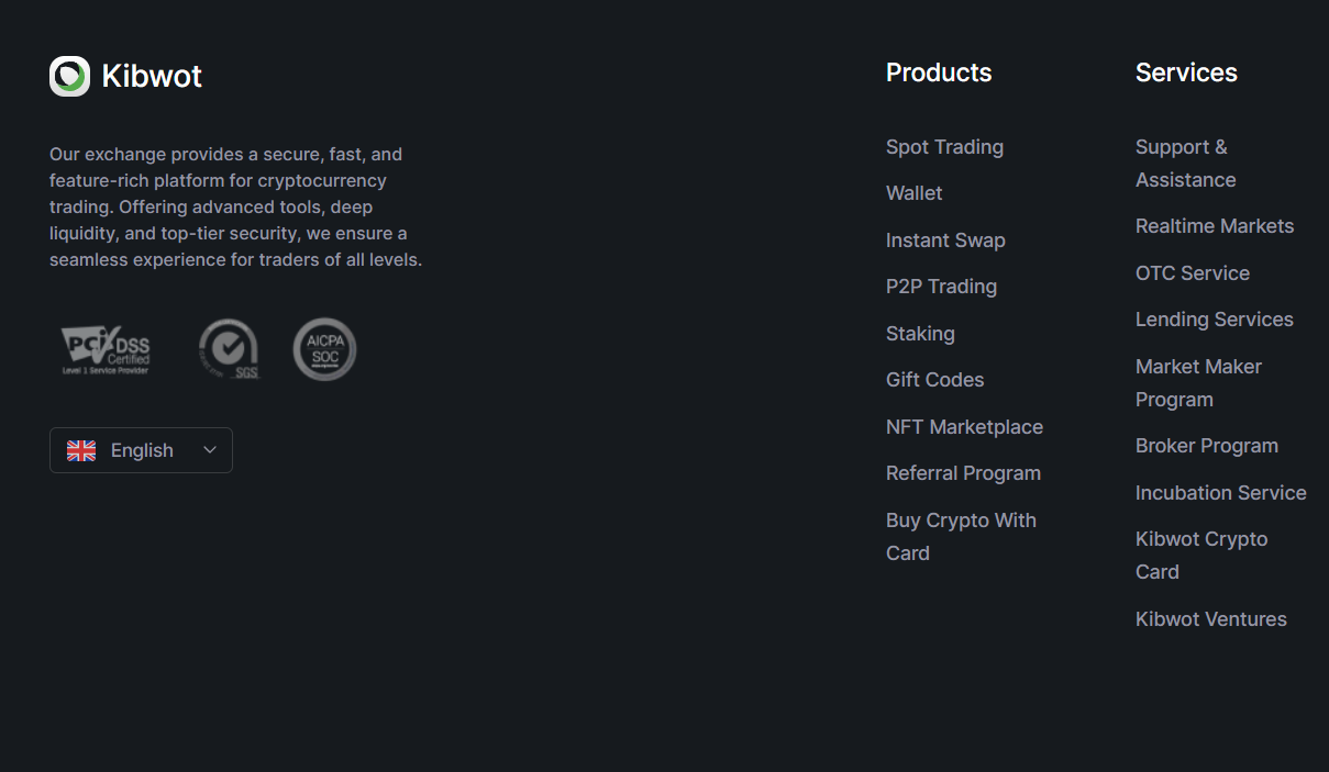 По поводу криптовалютной карты Kibwot подробной информации на сайте биржи нет. Написано только, что она доступна гражданам Европейской экономической зоны. О других услугах вроде брокерской программы и внебиржевой торговли тоже данных мало. Все можно узнать лишь при общении с поддержкой, которая доступна через онлайн-чат.