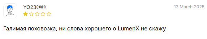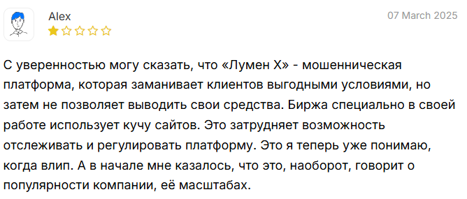 Чтобы понять, стоит ли делать аккаунт на данном ресурсе и доверять бирже свои деньги, стоит ознакомиться с отзывами о lumenx66 com. В Сети нет так много комментариев, но те, который удалось найти, настораживают, ведь положительных среди них нет. Клиент Alex ставит единицу — низшую оценку бирже и рассказывает, что понес финансовые потери с этим ресурсом.