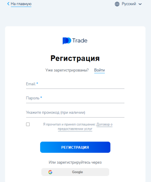 Чтобы получить доступ к функциям платформы, необходимо зарегистрировать на ней учетную запись. Причем это придется делать даже в том случае, если клиент хочет только ознакомится с демо-счетом. Иначе некоторые разделы не будут отображаться).