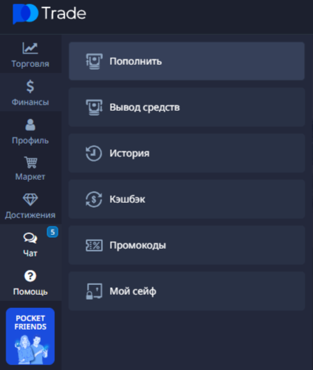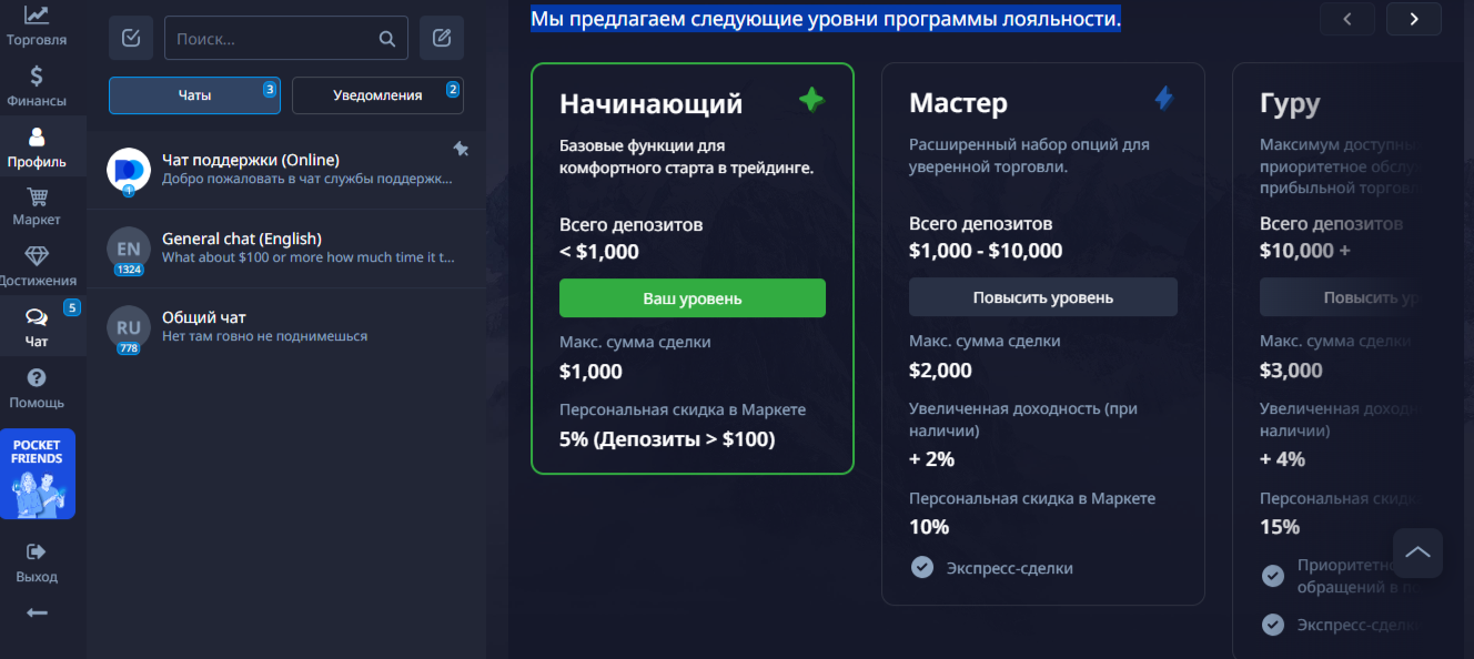 В обзоре биржи Pocket Option отметим, что таких опций как стейкинг, электронный кошелек, обменник и прочих нет. Подобные функции актуальны для узкоспециализированных криптовалютных платформ, не связанных с бинарными опционами. P2P переводы на площадке также не представлены, большинство активов покупаются и продаются по схеме OTC.