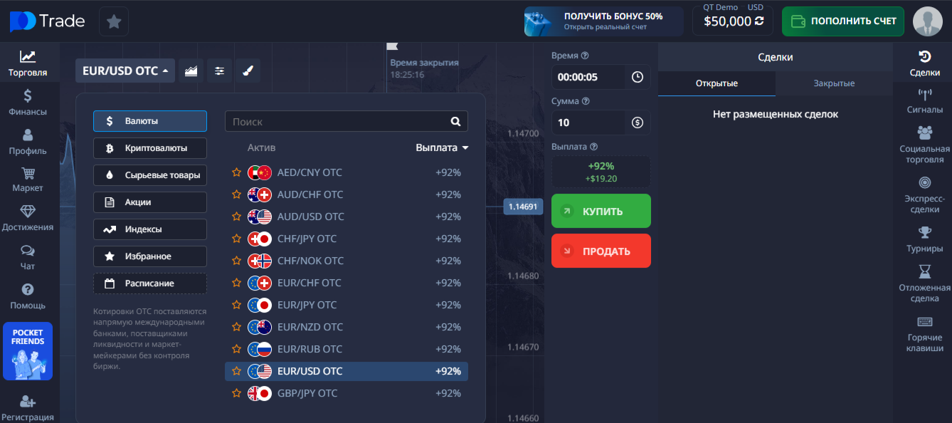 Маржинальная торговля на Pocket Option Com в России, как и во многих других странах, недоступна. Биржа не предлагает кредитное плечо. Клиентам доступны такие виды активов как валюта, сырьевые товары, акции, индексы и криптовалюта. На сайте представлена 181 торговая пара (из них 78 фиатные), но не все они бывают открыты для выставления ордеров. Основной комбинацией является EUR/USD.