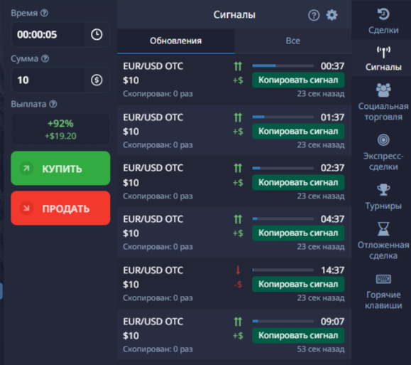 - Сигналы. Раздел содержит точки захода в сделки с высокой доходностью. Трейдер может бесплатно копировать сигналы Pocket Option и выставлять на основе этой информации ордера.