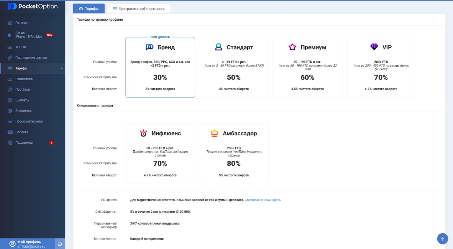 Кроме того, на бирже с 2018 года действует партнерская программа, при помощи которой можно получать дополнительный заработок на «Покет Опшен». Сумма начислений зависит от того, сколько новых пользователей трейдер привлечет на платформу. Размер бонусов по партнерке может составлять от 30 до 80%.