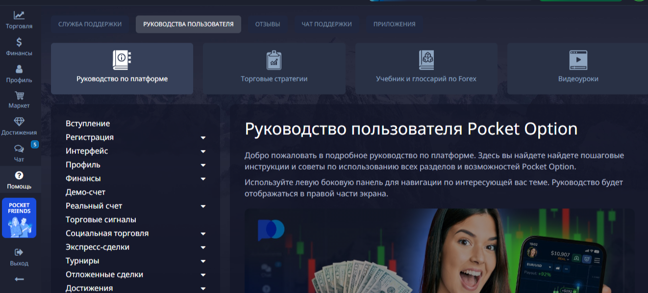 На сайте имеется раздел «Обучение в Pocket Option». Доступ к нему бесплатный. Хотя торговля бинарными опционами не рассчитана на новичков, готовые стратегии Pocket Option, учебные материалы и демо-счеты должны помочь трейдеру наработать нужные навыки без риска потерять депозит.
