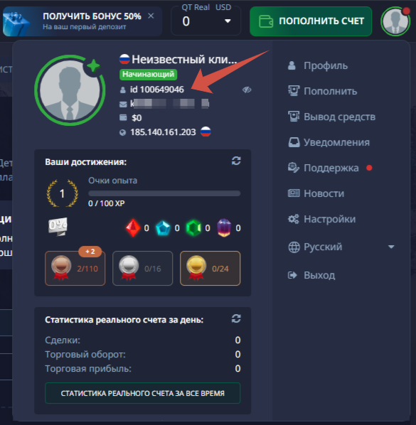 Реквизиты (id) аккаунта можно посмотреть в шапке профиля пользователя. Эта информация необходима только в случае пополнения криптовалютой.