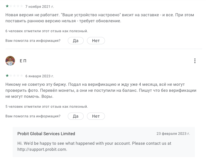 Также есть и откровенно негативные отзывы о probit com. Пользователи утверждают, что они перевели деньги по выданным на бирже реквизитам, но не получили эти средства на баланс своего счета на платформе. Также есть жалобы, что процесс верификации затягивают на месяцы. Правда, подтверждений этим претензиям ни один из авторов таких сообщений не приводит.