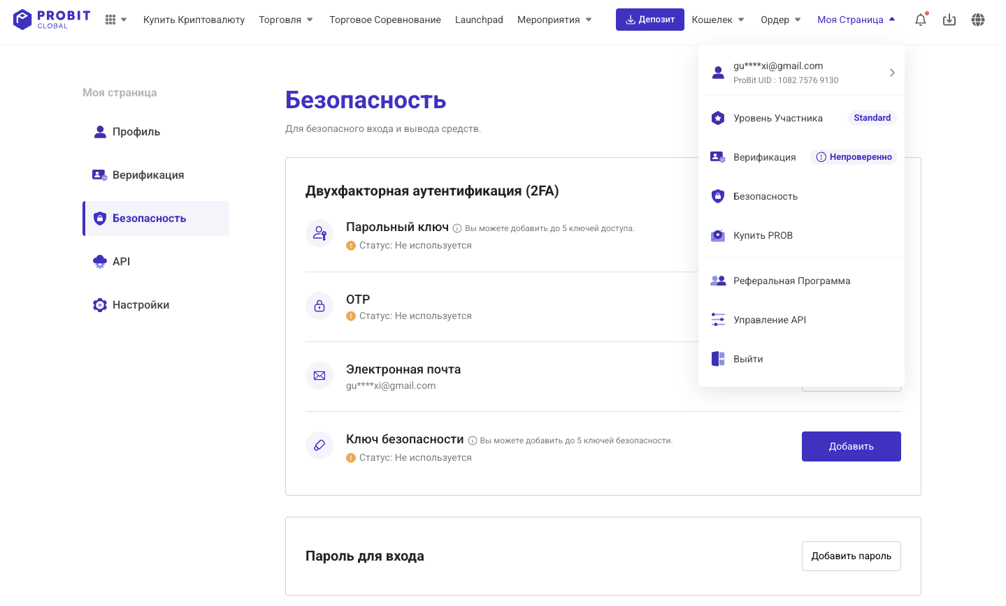 Для защиты аккаунта на криптобирже Probit Exchange предусмотрена двухфакторная аутентификация. Чтобы ее включить, нужно в меню «Моя Страница» кликнуть по пункту «Безопасность».