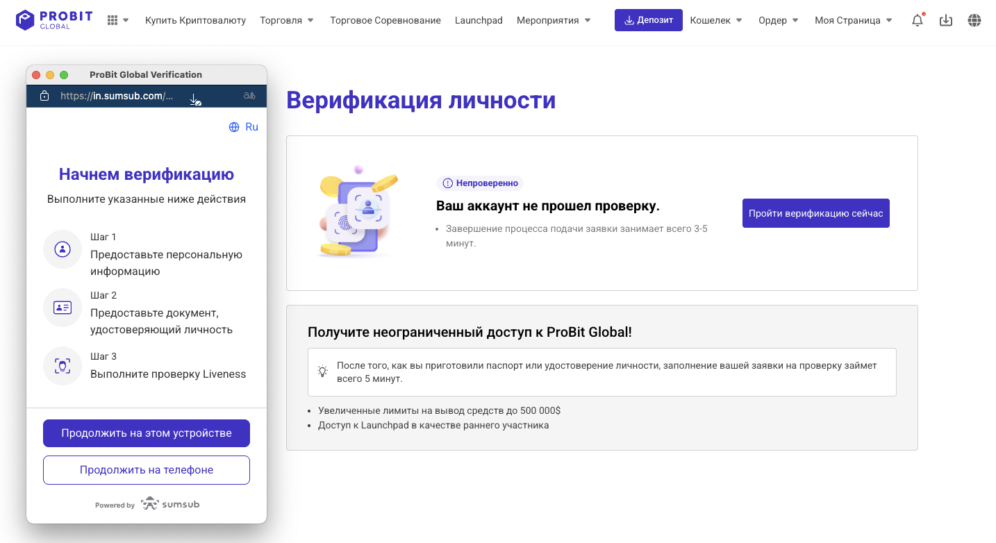 Заявлено, что проверка представленных данных и фотографий на бирже ProBit Global занимает в среднем 10–60 минут. Но владельцы платформы оставляют за собой право продлевать данный процесс до 48 часов.