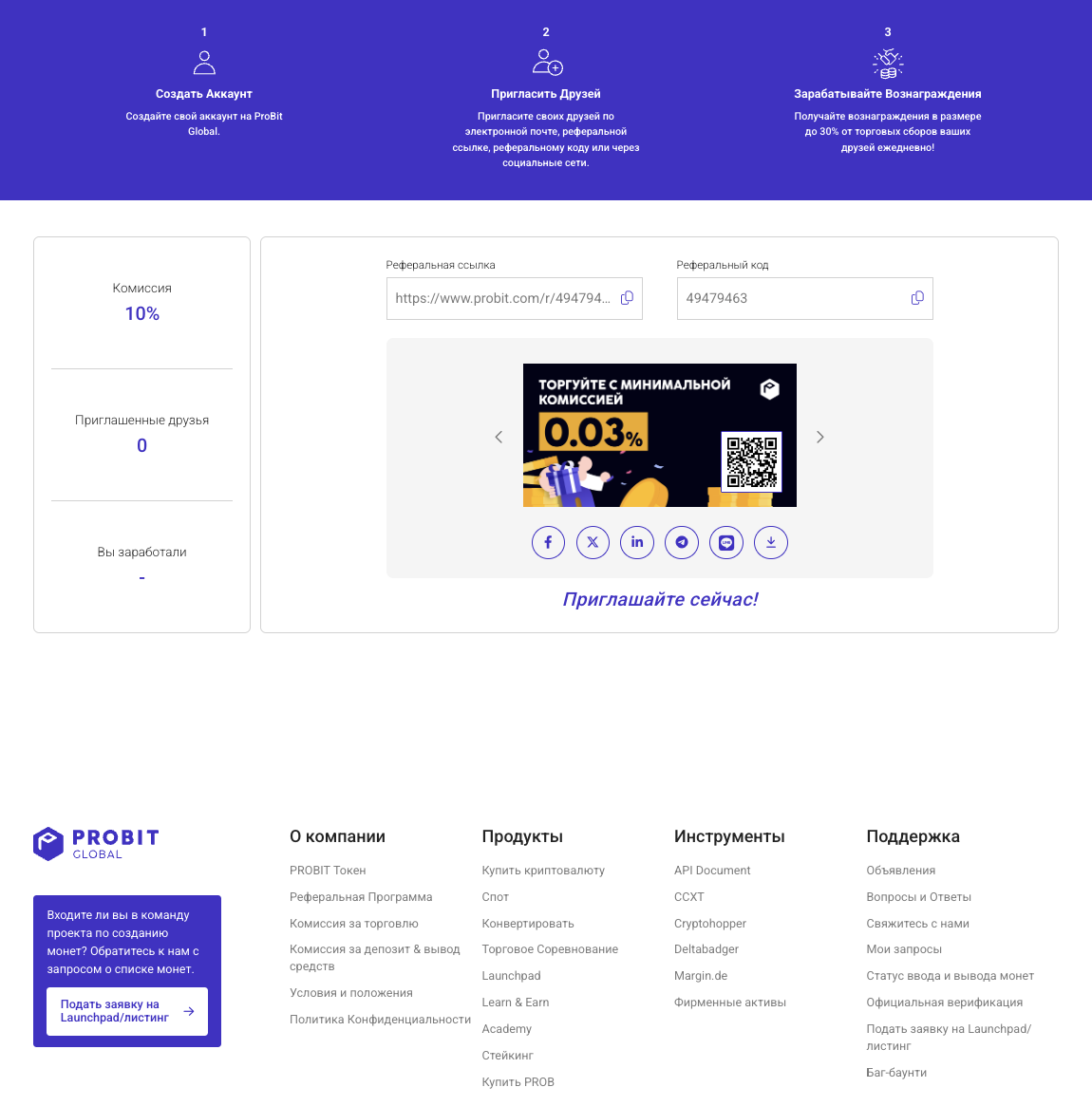 У биржи ProBitExchange есть и партнерская программа. Ее участники получают по 10% от торговой комиссии своих рефералов.