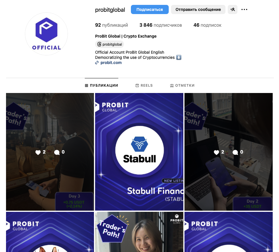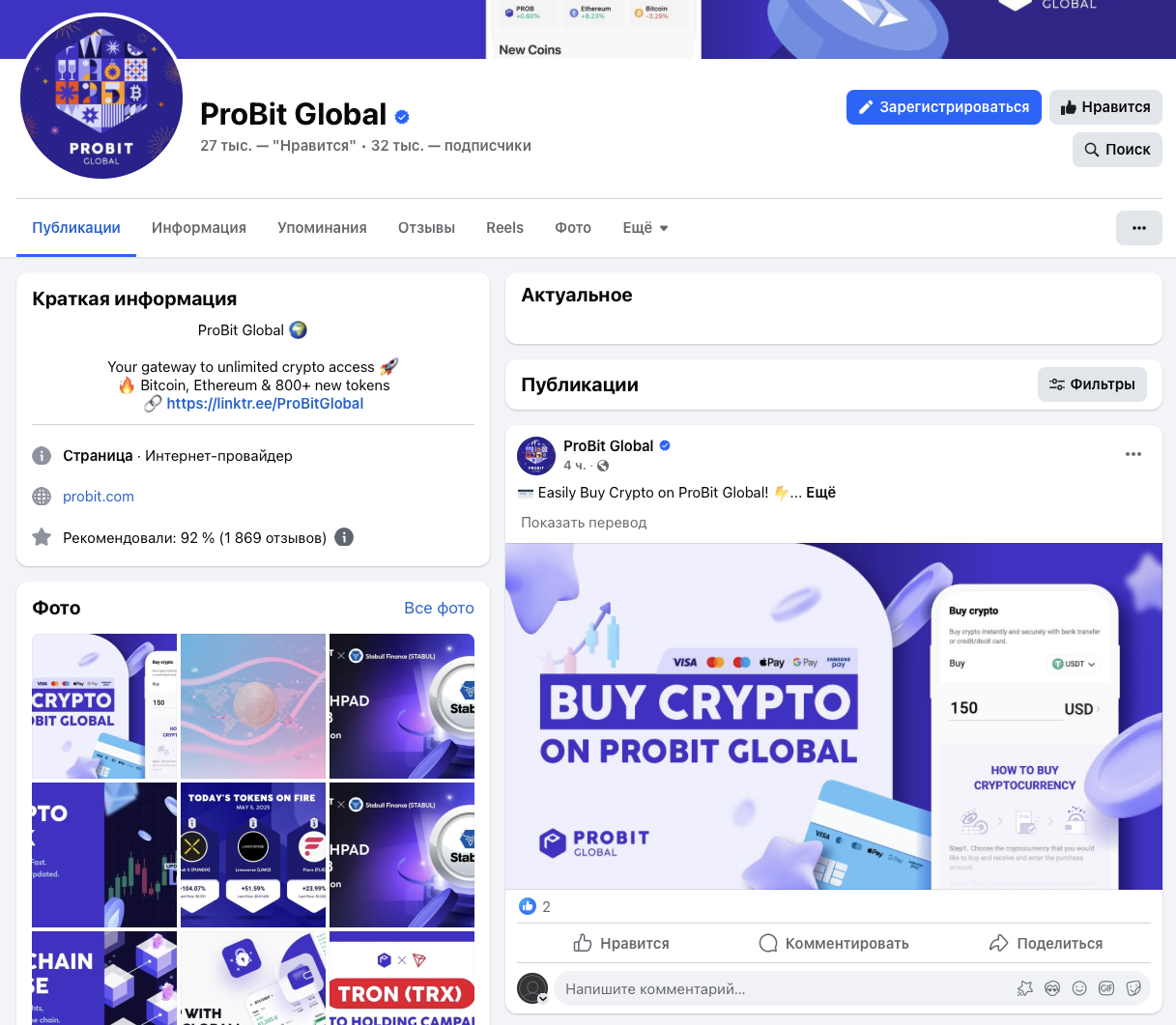 На странице ProBit Global по адресу Probitexchange на Facebook более 32 тысяч подписчиков. Новый контент в ленте данного аккаунта выходит регулярно и часто, но взаимодействий от фолловеров не получает.