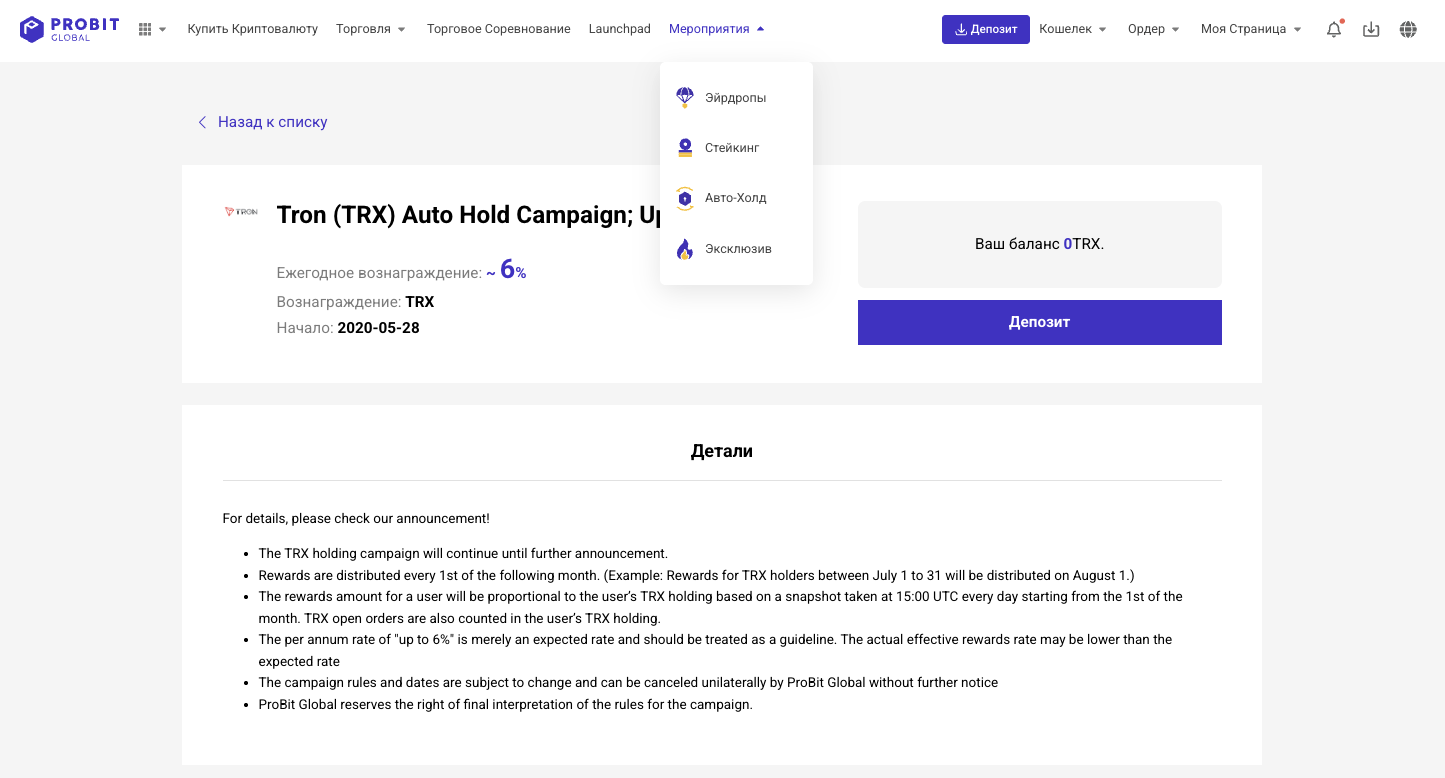 - Автохолдинг TRX — биржа платит 6% годовых за заморозку токена в сети TRON.