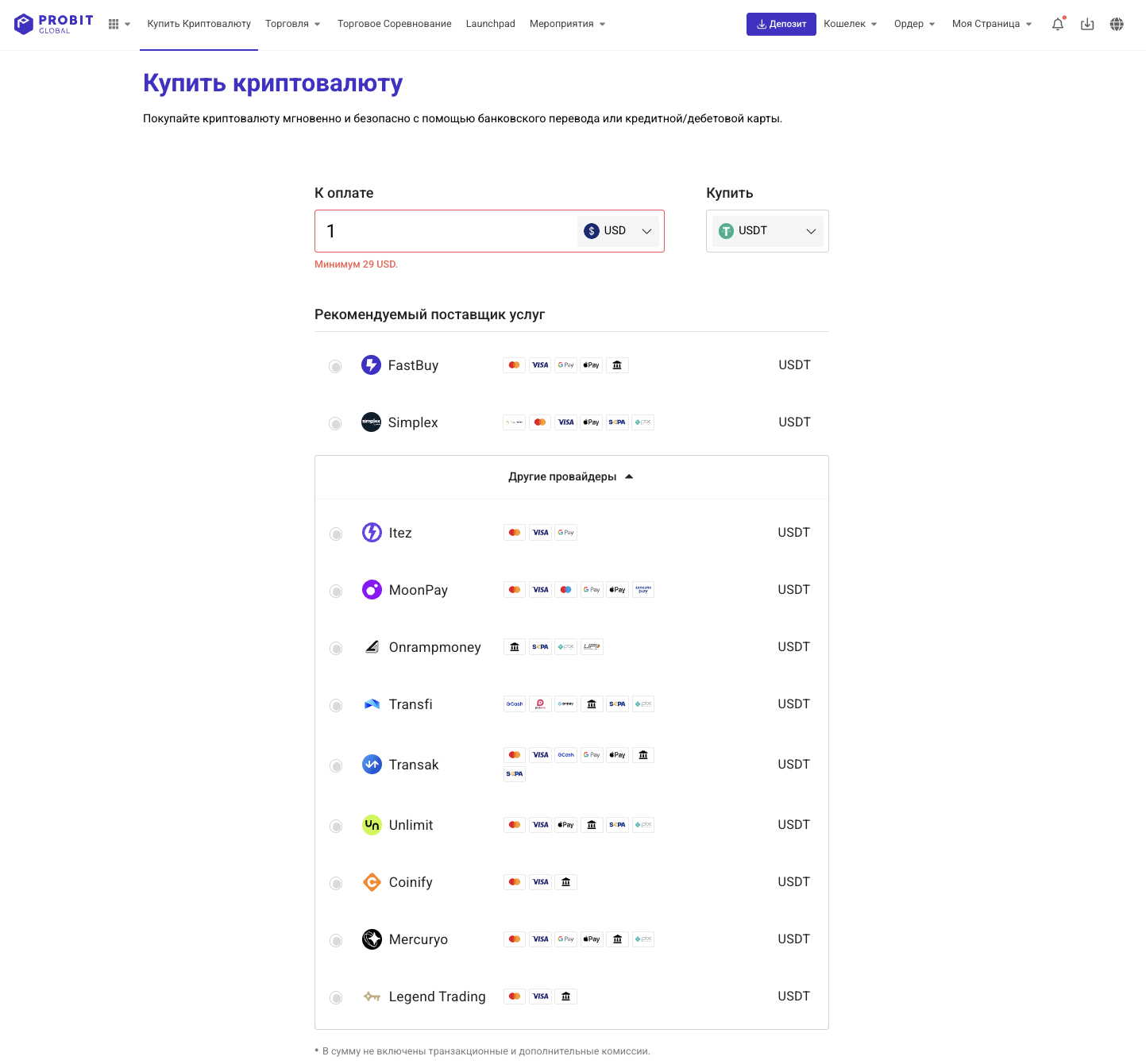 На бирже probit com можно купить криптовалюту при помощи банковских карт. Эту услугу оказывают через посредников. Минимальная сумма, на которую можно купить, например, токены USDT TRC-20, составляет 29 долларов. Для каждой монеты действуют уникальные лимиты.