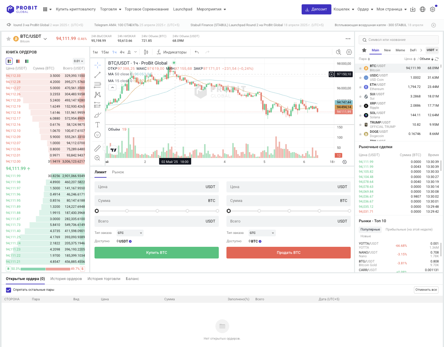 Совокупный оборот всех криптовалют на бирже ProBit на 6 мая 2025-го года, составил 284,8 миллиона долларов или 2819 BTC.