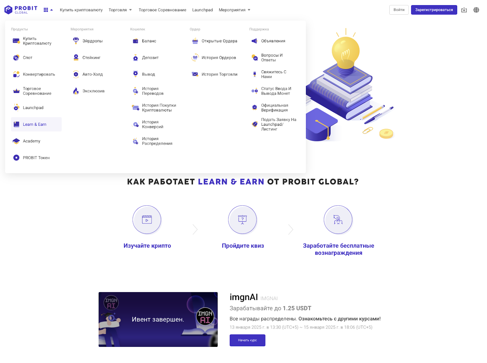 На бирже ProBit есть раздел с обучающими материалами. Чтобы в него попасть, нужно в главном меню кликнуть по пункту в девятью точками. В развернувшемся подменю следует нажать на подпункт Learn and Earn.
