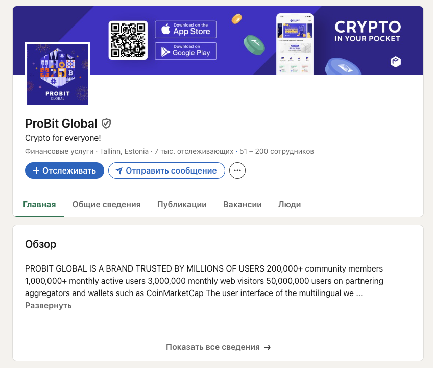 Страницу ProBit Global отслеживают 7 тысяч пользователей социального сервиса LinkedIn. Согласно информации на этом аккаунте, у компании более 50 сотрудников.