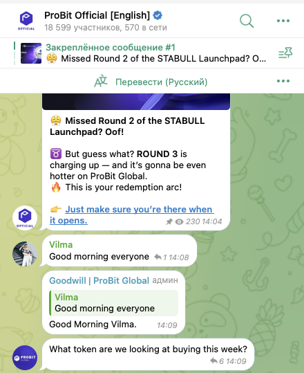 Участники сообщества могут общаться в официальном телеграм-чате биржи ProBit Global Official, адрес ProBitGlobalOfficial. В этом комьюнити состоит около 18,6 тысяч человек, но только 500–600 из них находится онлайн. За сутки в ленте данного аккаунта появляется по 20–30 новых сообщений.