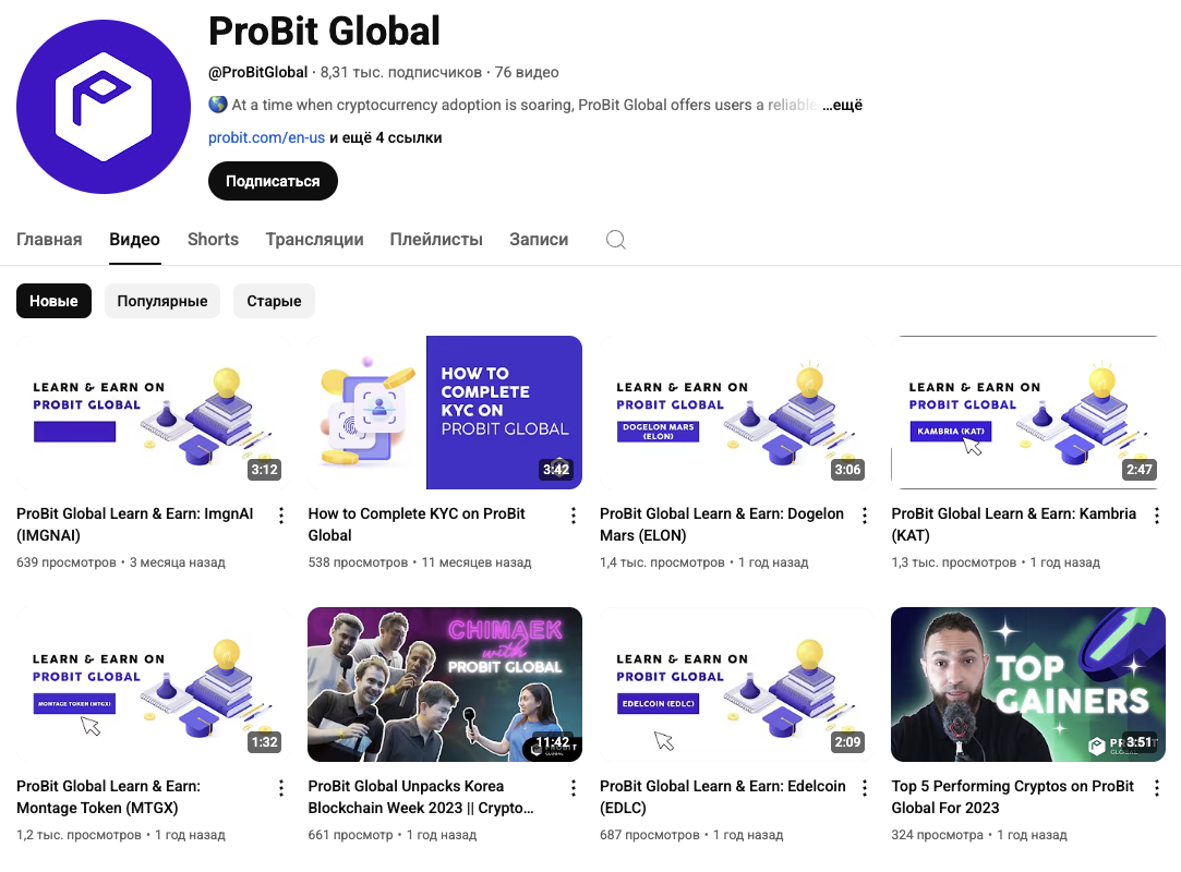 У проекта есть канал на YouTube — ProBit Global по адресу Probitglobal. На него подписано около 8,31 тысячи пользователей. Новые ролики на канале выходят по 3–5 раз в год, и они собирают всего по 500–1500 просмотров.