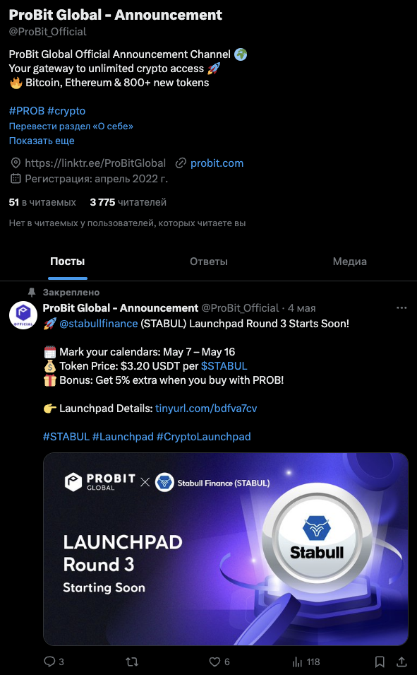 На страницу ProBit Global Announcement, ProBit Official по состоянию на 6 мая 2025-го года подписано около 3,8 тысяч читателей. Но выложенная 4 мая и закрепленная публикация получила всего 118 показов.