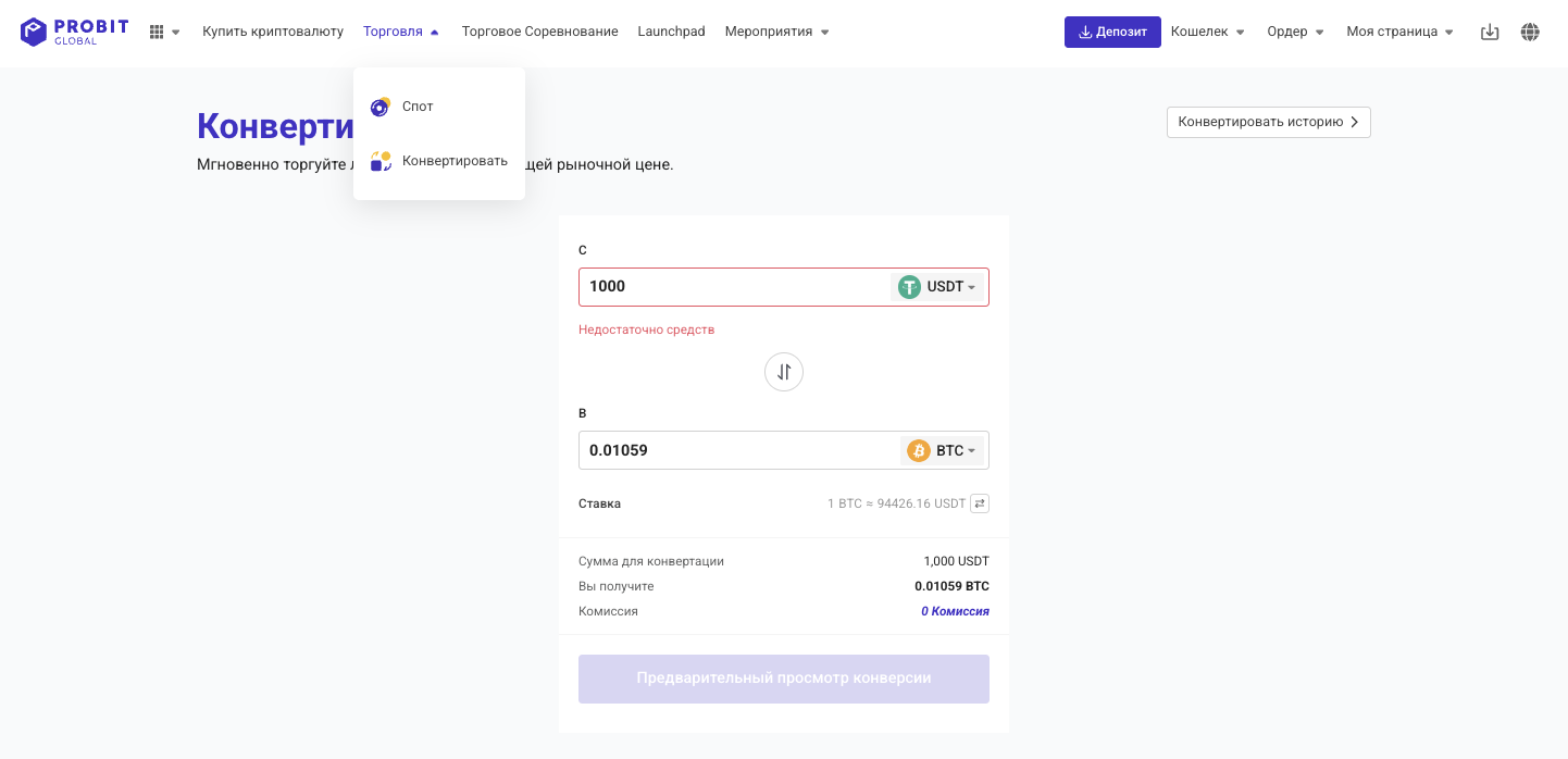 На «Про Бит» доступен обмен одних активов на другие. Для совершения эксчейнджа сначала следует в меню «Торговля» нажать на пункт «Конвертировать». В форме на загруженной странице потребуется выбрать валютную пару и ввести сумму для обмена.