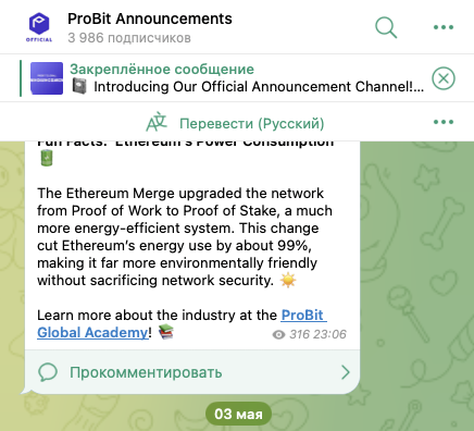 На TG-канал ProBit Announcements, по состоянию на 6 мая 2025 года подписано около 4 тысяч пользователей. Публикации просматривают в среднем 300–400 раз. Комментарии открыты, но в них нет обсуждений. Посты не собирают реакций от читателей.