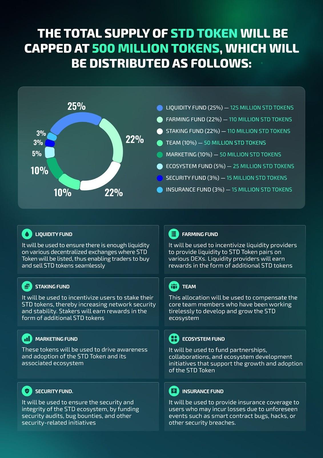 Всего выпустили 500 миллионов STD. Из них 25% направили на поддержку ликвидности, 22% и ещё 22% – на фарминг и стейкинг, остальное распределили среди пользователей и команды. Всего было 3 эирдропа в 2023 году. Токены STD раздали по цене 0,3, 0,4 и 0,5 USD. Листинга на крупных биржах ещё не было. Торговать монетой можно только на S-Trade в паре с SWCT. Цена STD/SWCT сейчас – 1,25. Это примерно 0,06 доллара за 1 STD.