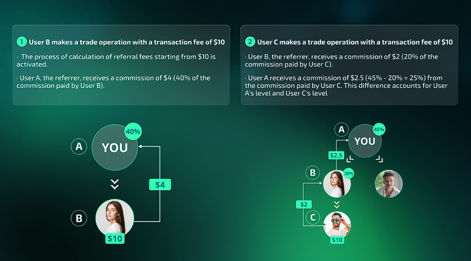 Ещё один способ заработка — реферальная программа. Для участия в ней пользователь должен пройти верификацию личности и завершить хотя бы одну сделку на бирже. За приглашения друзей можно получать до 50% с их комиссий.