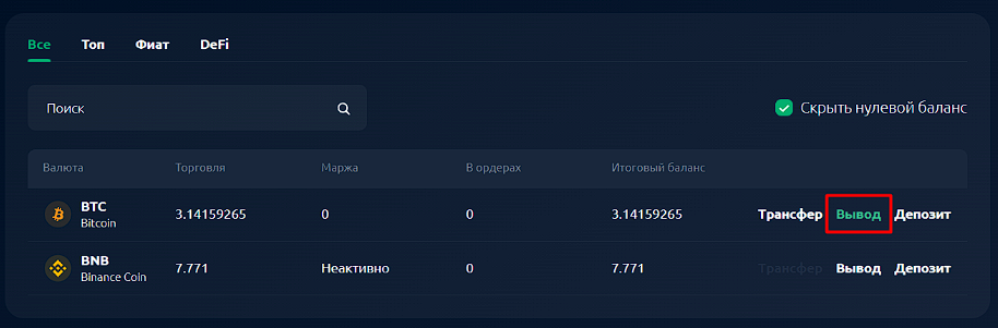 Чтобы подать заявку на вывод средств, нужно зайти в раздел «Кошелёк». Далее кликнуть на «Вывод» и выбрать нужную крипту. По адресу транзакции или QR-коду можно получить выбранный токен на внешний кошелёк или счёт биржи. Администрация обращает внимание, что отменить запрос на вывод невозможно.
