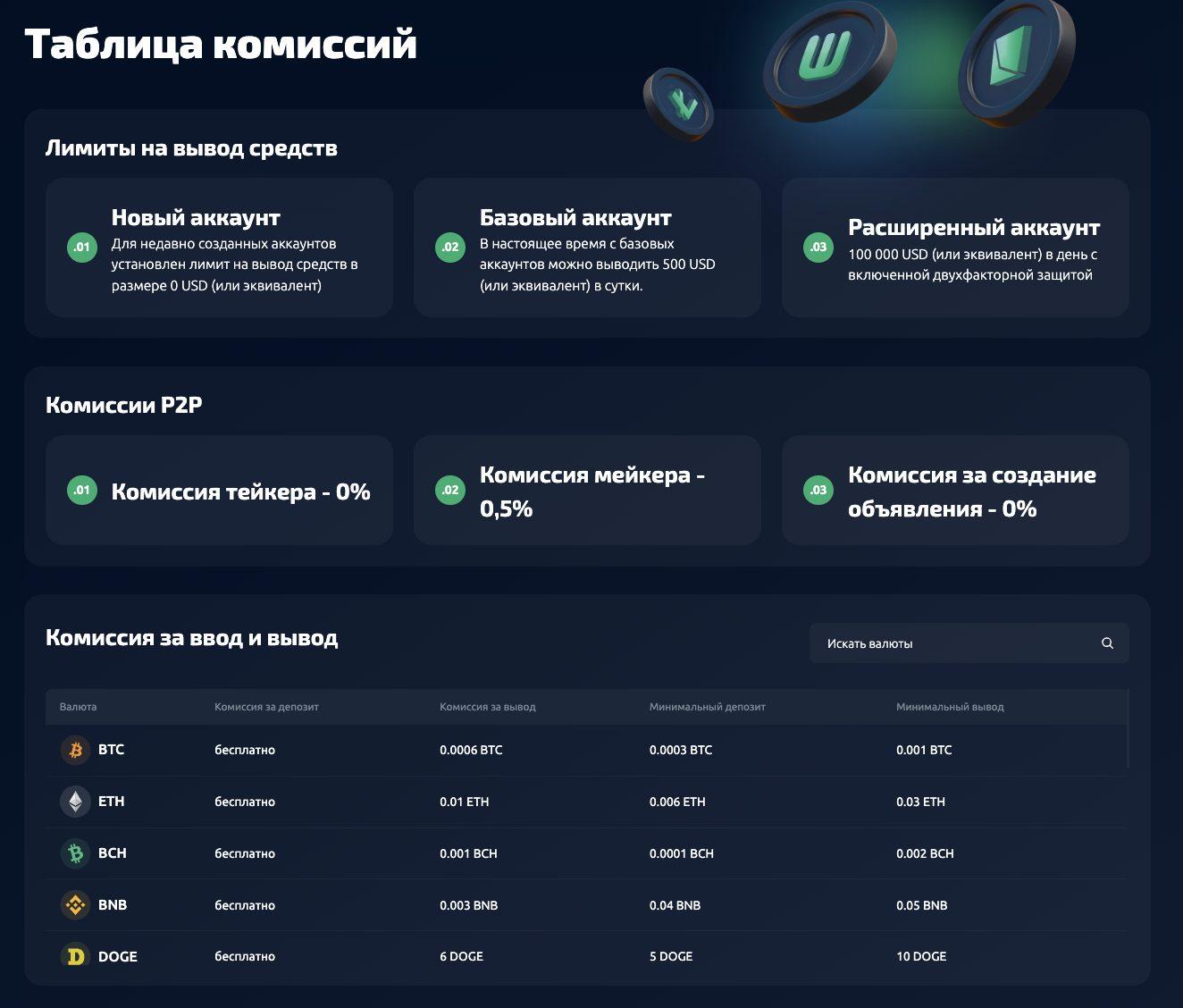 На бирже относительно низкие комиссии, однако строгие лимиты для неверифицированного и базового аккаунта. Чтобы получить адекватные торговые возможности, придётся полностью завершить проверку личности. Актуальные данные о комиссиях представили в таблице ниже.
