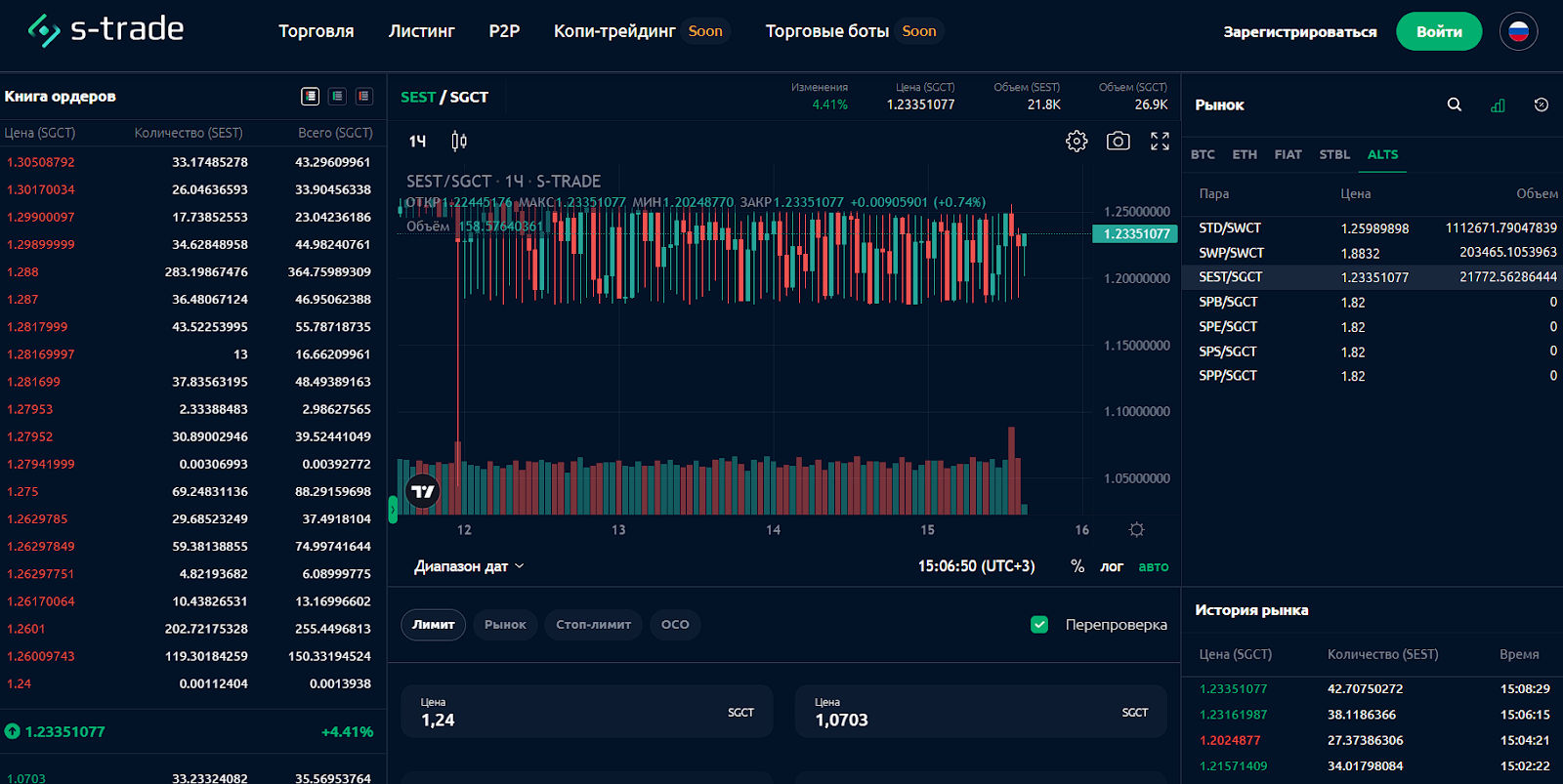 Сейчас на S-Trade доступен базовый набор функций: спотовая торговля и P2P-обмен. Есть около 10 торговых пар и классические коины — Bitcoin (BTC), Ethereum (ETH), а также стейблкоины — SGCT и SWCT в парах с USDT. Дополнительно можно торговать фиатными валютами, включая доллар и евро.