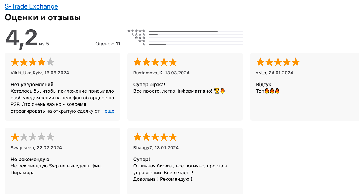 В основном отзывы о S-Trade есть на сервисах Apple и Google. Люди пишут, что приложение очень информативное и удобное. Некоторые считают небольшим минусом отсутствие push-уведомлений об исполнении ордеров. Есть люди, которые не рекомендуют биржу, так как она не выводит деньги. Судить о точности этих комментариев сложно, так как они не подтверждены реальными фактами.