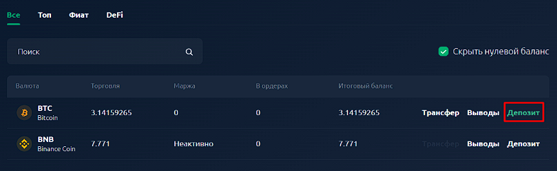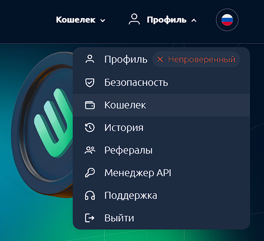 Чтобы внести средства на бирже, нужно зайти в раздел «Кошелёк».